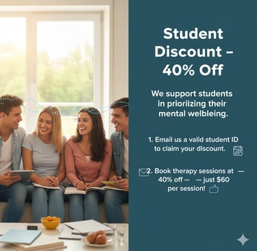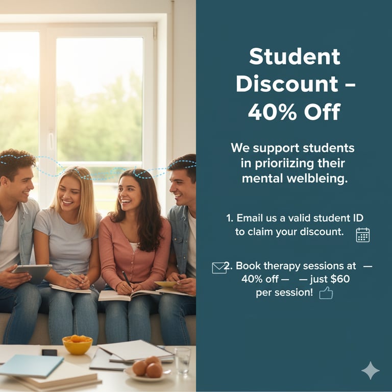 All therapy sessions listed below are available online via video or phone and can be booked from Wednesday to Saturday, between 9 am and 8 pm. Face-to-face sessions are also offered for an additional $25 per session. To check the availability of your preferred time or to arrange an in-person appointment, please contact us via email or phone.